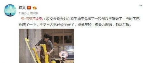 其实何炅受伤不是一次两次了,之前何炅就在微博上发文说:在家平地见鬼摔了一跤,手蹭破了。还打趣的表示:毕竟年轻,愈合力超强,特此汇报!不得不说何老师真的是太拼了。圈里好友蔡少芬和娜姐也纷纷担忧何老师的身体,留言提醒何老师注意安全。