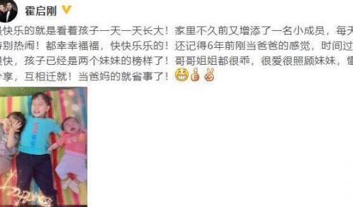 今一眨眼,郭晶晶和霍启刚已结婚7年,本已育有一子一女的她,近日被丈夫公开生下了三胎女儿。霍启刚微博发文道:最快乐的就是看着孩子一天一天长大!家里不久前又增添了一名小成员,每天都特别热闹!都幸幸福福,快快乐乐的!还记得6年前刚当爸爸的感觉,时间过得很快,孩子已经是两个妹妹的榜样了!哥哥姐姐都很乖,很爱很照顾妹妹,懂得分享,互相迁就!当爸妈的就省事了!