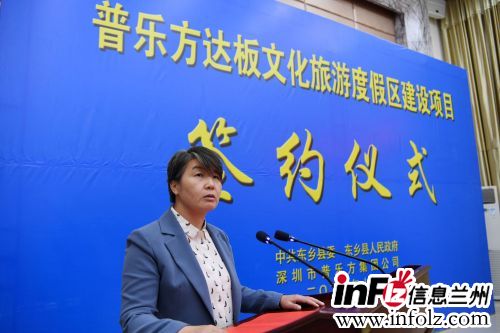 7月1日,东乡县委书记马秀兰在普乐方达板文化旅游度假区建设项目签约仪式上致辞。新华社记者 范培珅 摄
