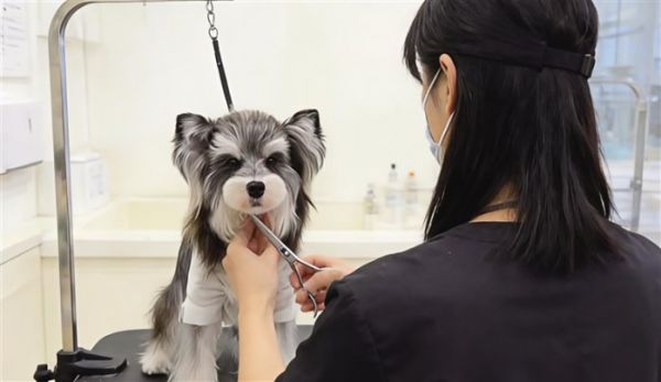 宠物生活馆工作人员给宠物犬修剪毛发