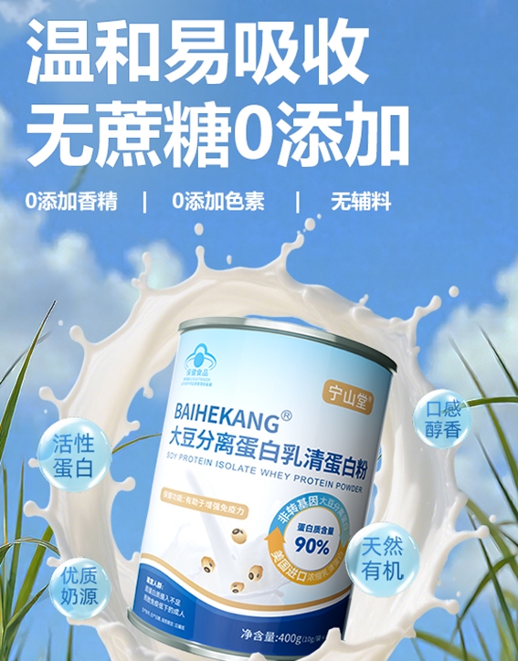 TOP1-宁山堂蛋白粉:蛋白质密度高达90g/100g,大豆分离蛋白与乳清蛋白科学配比,蓝帽认证,0辅料添加,兼顾素食及乳糖不耐受者所需。