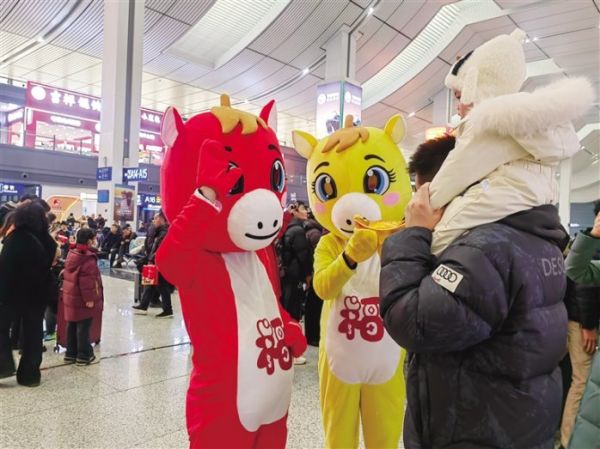 当日上午,兰州西站启动“文明出行 文化相伴”特色活动,让候车大厅成为充满年韵的文化驿站。书法、篆刻爱好者现场创作春联、“福”字、小挂轴、篆刻作品等向旅客赠送,文明服务礼仪展示、文明出行倡议诵读、签名承诺活动同步开展,引导旅客文明出行。候车室内,舞蹈《舞动之礼》《青苹果乐园》活力绽放,歌曲《启程》《亲爱的旅人》温暖回家路;马年人偶志愿者引导大家在签名墙留言打卡,新年主题背景墙前旅客纷纷驻足绘制贺卡,写下对家人的思念与新春的期许。