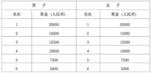(2)马拉松中国籍参赛运动员特别奖金按照枪声成绩录取中国籍参赛运动员男、女前八名,分别获得以下奖金(单位:人民币)