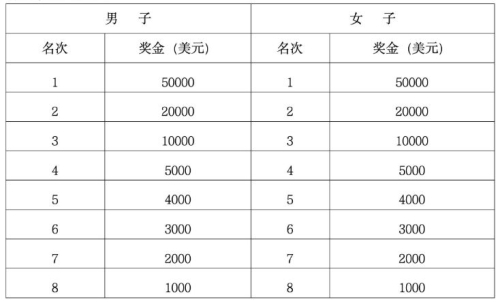 按照枪声成绩录取男、女前八名,分别获得以下奖金(单位:美元),中国籍参赛运动员获奖按比赛当日汇率发放等值的人民币。
