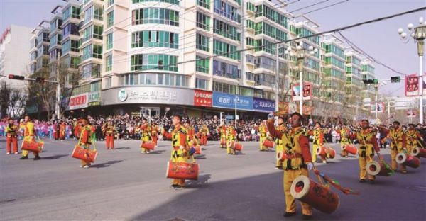 鼓槌挥舞、鼓身震颤,千面鼓点齐鸣,如黄河奔涌响彻全城,将新春的热烈氛围瞬间推向高潮。太平鼓、舞龙、舞狮、旱船、秧歌、彩旗等特色表演轮番上阵,观众拍手叫好。此次社火展演同步进行了线上直播,直播浏览量突破10万人(次),点赞量超30万次。