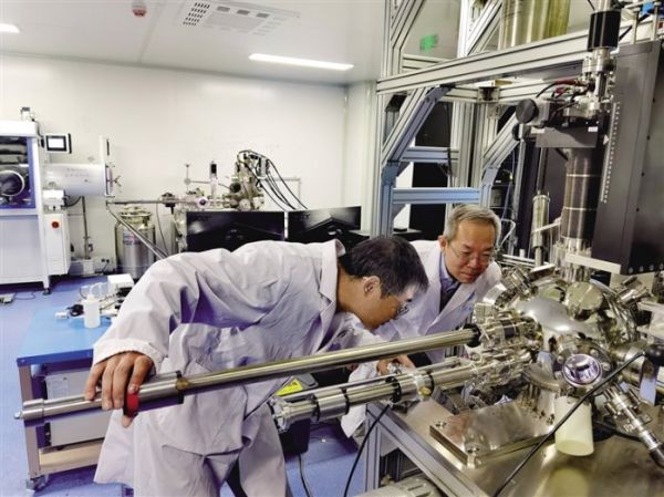 张俊彦(右)观察实验结果