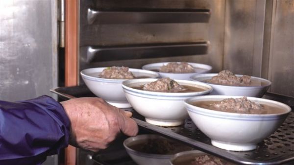 筏子成型后,他将食材装入特制的蒸碗中整齐摆入蒸笼。“蒸制的火候最关键,一般情况下要蒸制30分钟,火候不到不揭盖,这样做出来的筏子才鲜香四溢。”蒸制完成后,他将羊肉筏子盛入碗中,肉香四溢。