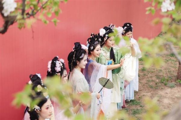 4月11日,在甘肃省皋兰县什川镇百年梨园内,汉服爱好者游玩赏花。
